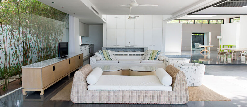 Với thiết kế bằng cửa kính mở trượt xung quanh nhà tạo ra một không gian mở, thoáng mát và tối đa hóa tầm nhìn hướng biển. Mỗi biệt thự đều có hồ bơi riêng ngay sát bên phòng khách và bãi cát trắng mềm mại của bãi biển Hồ Tràm.