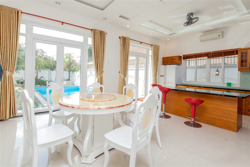 – Thiết kế: Diện tích sử dụng trên 700m2 với 05 phòng ngủ có 5 giường đôi và nệm dự phòng, đồ nội thất cao cấp, sang trọng tiêu chuẩn khách sạn; phòng khách sang trọng và phòng bếp đầy đủ trang thiết bị. Các phòng đều có toilet riêng biệt mang lại sự tiện nghi. 6 Phòng tắm đầy đủ khăn và đồ dùng cá nhân,