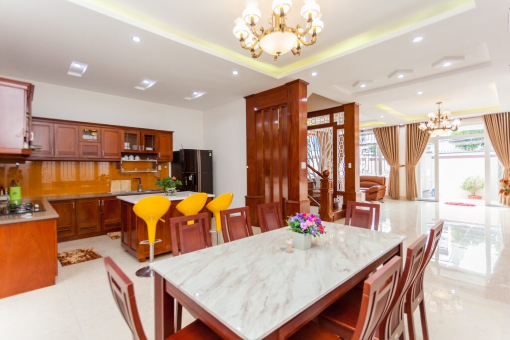 – Phòng bếp rộng rãi, đầy đủ đồ dùng nấu bếp: lò vi sóng, lò nướng, nồi cơm điện, bình đun siêu tốc, tủ lạnh, chén bát…